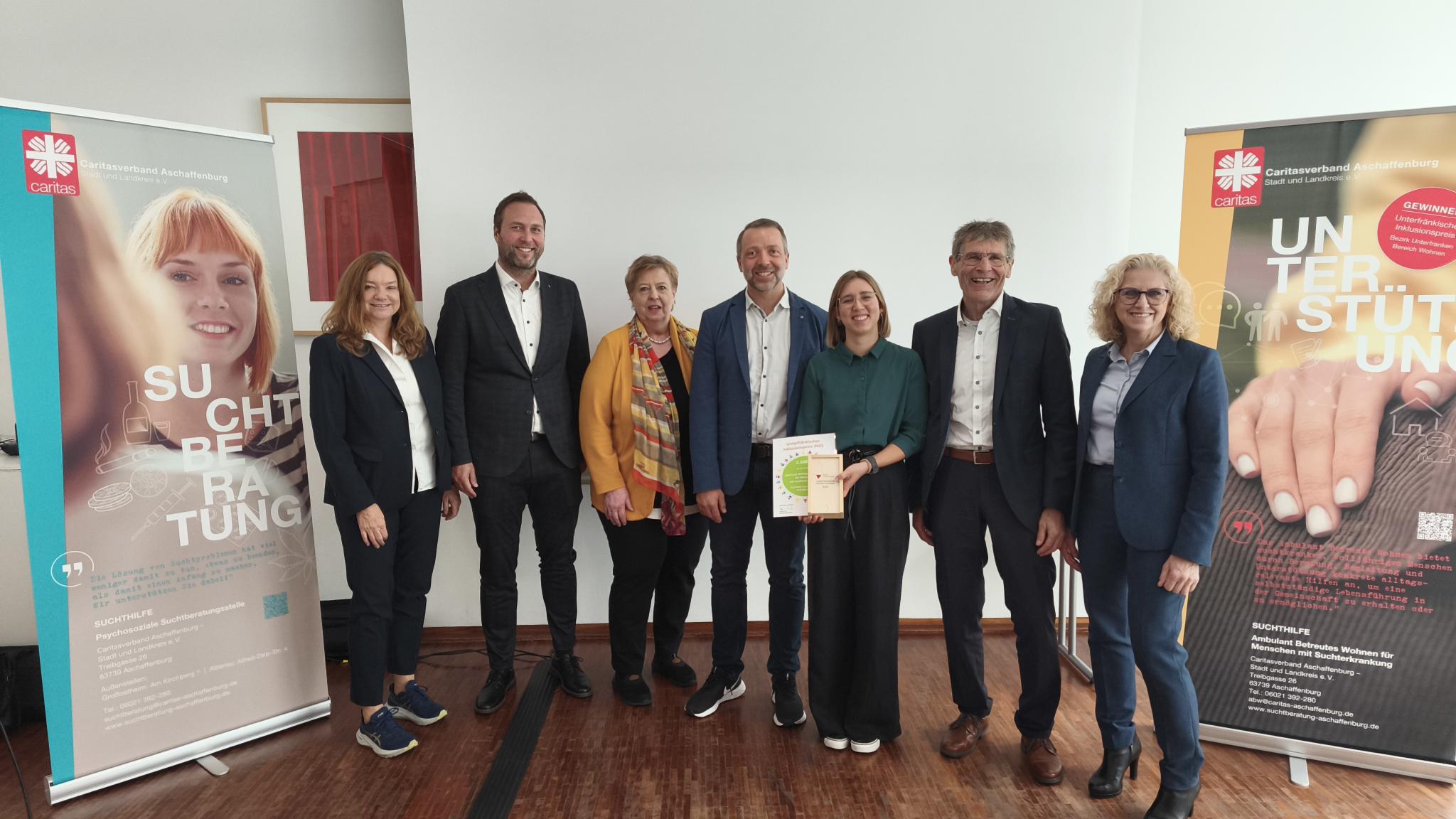 Wohngemeinschaft für Menschen mit Suchterkrankung erhält Inklusionspreis (v.l.n.r.): Jessica Euler (Bürgermeisterin), Christopher Franz (Vorstand Caritasverband Aschaffenburg), Gerlinde Martin (Behindertenbeauftrage Bezirk Unterfranken), Daniel Elsässer (Leitung Soziale Dienste Caritasverband Aschaffenburg), Johanna Michel